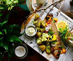 Pestki dyni / mix sałat / pomidorki cherry / grys malinowy / pomarańcza / grillowane jabłko / grzanka / masło szczypiorkowe / vinegret malinowy (zestaw)