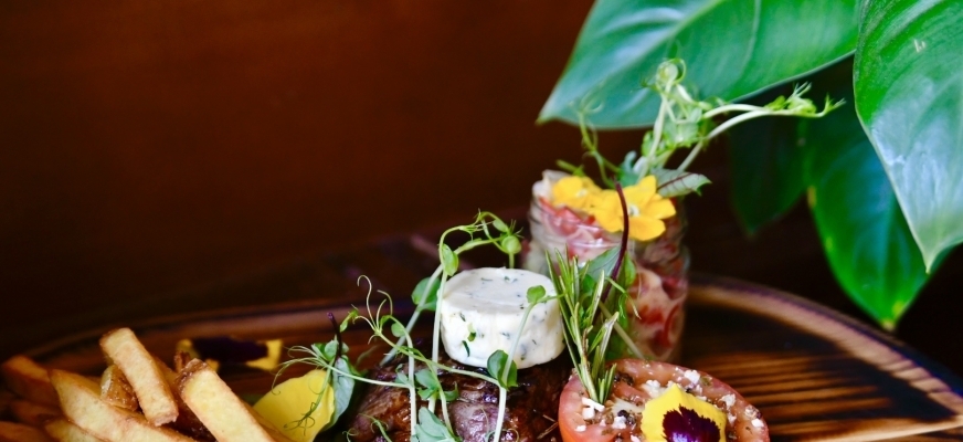 Boczniaki / cukinia / pomidorki cherry / masło ziołowe / frytki stekowe / demiglace czekoladowy (zestaw)