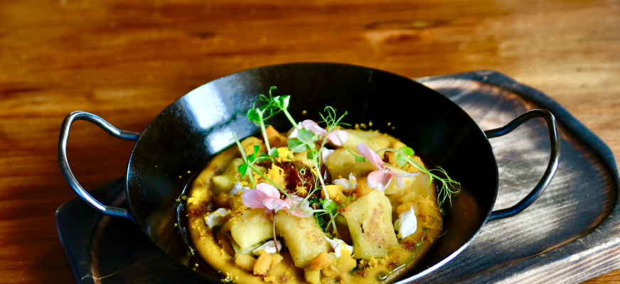 Restauracja Zmysły w Elblągu - Gnocchi z kozim serem na musie z dyni, z kostką karmelizowanej dyni hokkaido i figami na czerwonym winie