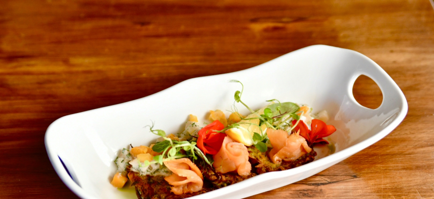 Restauracja Zmysły w Elblągu - Rosti dyniowo-ziemniaczane z płatkami wędzonego łososia i dresingiem jogurtowym z kawałkami dyni i szczypiorkiem / VEGE