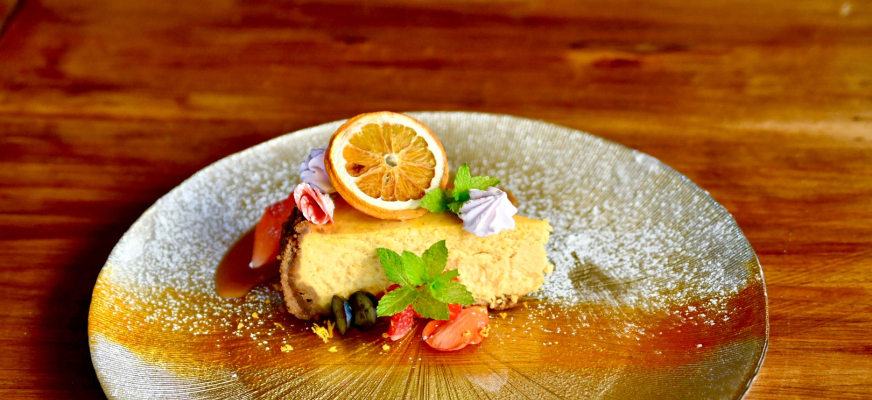 Restauracja Zmysły w Elblągu - Sernik Dyniowy na spodzie z ciasteczek Biscoff, ze słonym karmelem i musem z rokitnika