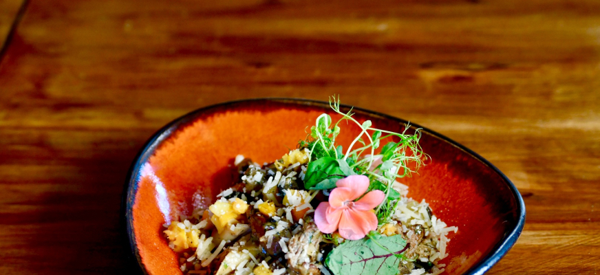 Szerokie wstążki makaronu pappardelle w sosie z grzybów leśnych z paskami polędwiczki wieprzowej, z dynią i płatkami grana padano / VEGE