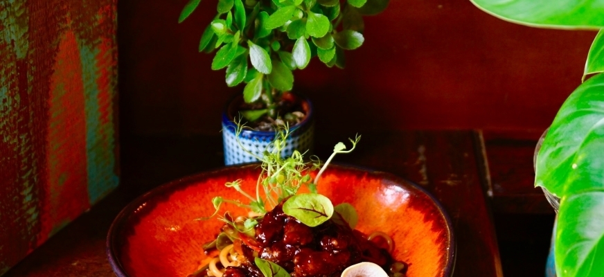 Restauracja Zmysły w Elblągu - Tajski Street Food VEGE - Makaron udon z chrupiącymi warzywami z woka i grzybami mun