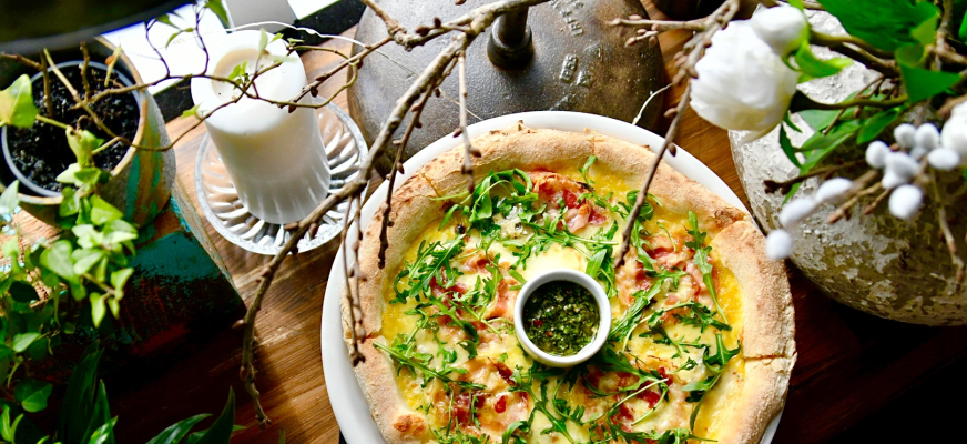 Restauracja Zmysły w Elblągu - Pizza na sosie z żółtych pomidorów i papryk, z dojrzewającą pancettą, gorgonzolą i orzeźwiającą salsą verde