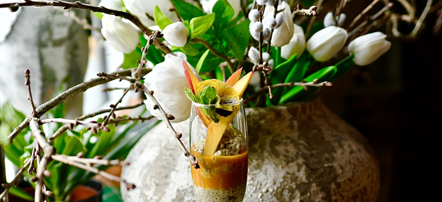 Restauracja Zmysły w Elblągu - Rajski deser chia na mleku kokosowym, z syropem klonowym, musem z mango i orzeźwiającą miętą