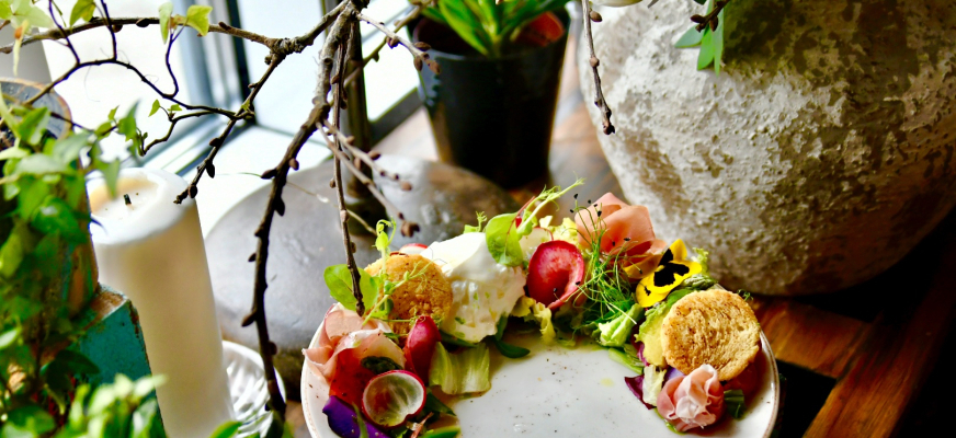 Restauracja Zmysły w Elblągu - Sałata z burratą, prosciutto crudo, ziemniakiem truflowym i avocado, z aromatycznymi dresingami: białym balsamico i vinegretem cytrynowym