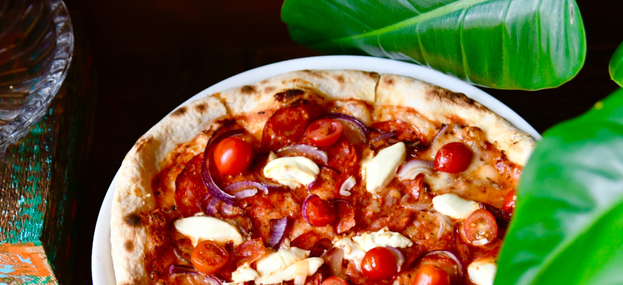 Sos pomidorowy / mozzarella / mascarpone / salami spinata / pomidorki koktajlowe / czerwona cebula (30 cm)